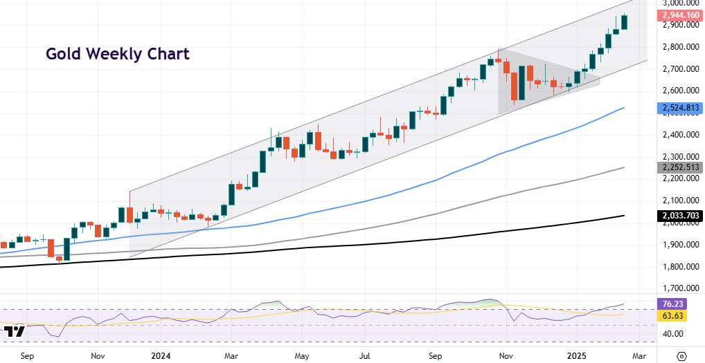 The upward channel remains firmly intact with the neat breakout from the triangle pattern around $2700. It’s now eight weeks of straight gains, that was last seen in August 2020. The round number of $3000 seemingly beckons, though haven demand could lessen in the months ahead if the ceasefire possibility in Ukraine turns more permanent. The rejection of the intraday top at $2954 is a warning sign, with prices overbought on several timeframes.