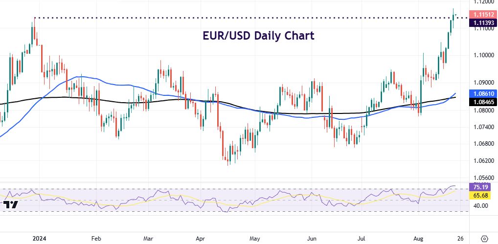 EUR pushed up to a new year-to-date peak above 1.1170 as it rallied for a fourth day. The ECB’s Panetta hopes the central bank cut rates again in September. Today sees the PMIs and ECB minutes.
