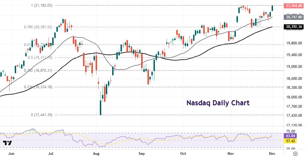 The tech-dominated index climbed 4.9% in November, reflecting optimism over pro-business policies under the incoming Trump administration. The previous intraday high is at 21,182. Prices look to be ripe for more fresh highs as investors focus on “US exceptionalism” and ongoing tech titan demand.