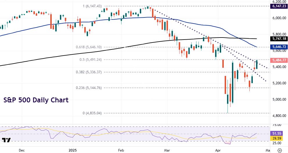 Prices have made their way back to the 50% retrace of this high to low move at 5,491. The major Fib level (61.8%) sits at 5,646, along with the 50-day SMA. The death cross seen around April 11 appears to have given a false signal. The move higher has also broken a couple of declining trendlines. Support resides at 5,336.