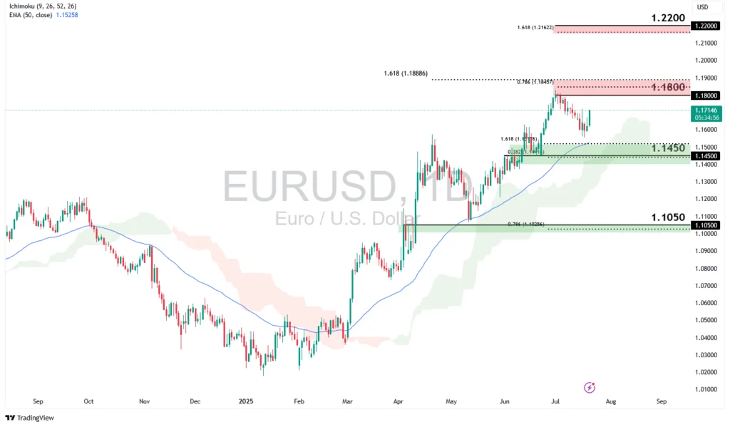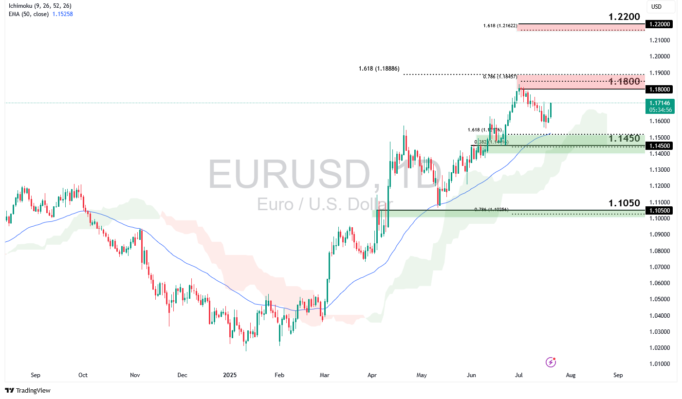EURUSD is approaching the 1.1450 support level, which aligns with the 38.2% and 161.8% Fibonacci extensions, Ichimoku cloud, and 50 EMA. This is a closely watched zone, where a strong price reaction is likely. If EURUSD bounces here, it could climb toward the 1.1800 swing high resistance, supported by a Fibonacci confluence area. Beyond that, the next resistance lies at 1.2200.