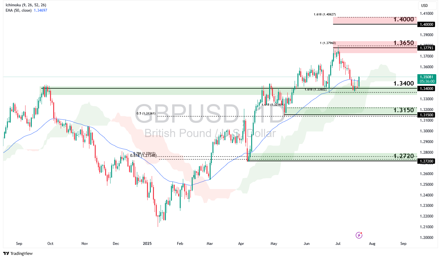 GBPUSD is currently testing the 1.3400 support level, which aligns with the Ichimoku cloud and the 161.8% Fibonacci Extension level. A break below this level could push the price lower toward the 1.3150 swing low support, or even the 1.2720 support, an area marked by strong Fibonacci confluence.