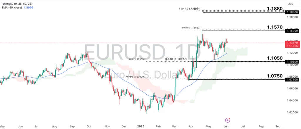 EURUSD continues to see bullish momentum, holding above the Ichimoku Cloud and 50-EMA. A clear break-and-close above 1.1570, which aligns with the 61.8% Fibonacci Extension, could open the door to further upside. The next key resistance lies around 1.1880, where the 161.8% and 100% Fibonacci levels coincide.