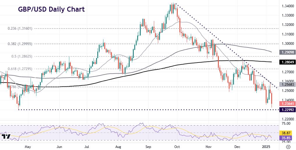 GBP plunged as gilt yields spiked higher. The 10-year yield broke to the upside, hitting levels last seen in 2008 at 4.81%. Cable sold off by more than 1% for most of the day and through last Thursday’s cycle low at 1.2351.