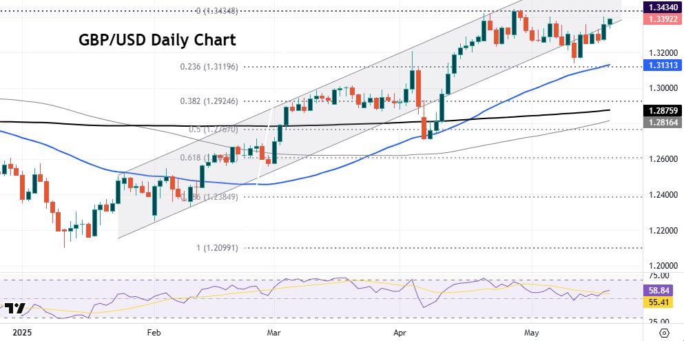 UK rates are predicted to remain steady in June, with the focus instead on August for the next potential cut, keeping with the current quarterly pace of reductions. There is roughly a 72% chance of a 25bps august rate cut, with September fully priced. Cable is still stuck in a range between the mid-May low below 1.32 and the late April high at 1.3434. The 50-day SMA sits at 1.3131.