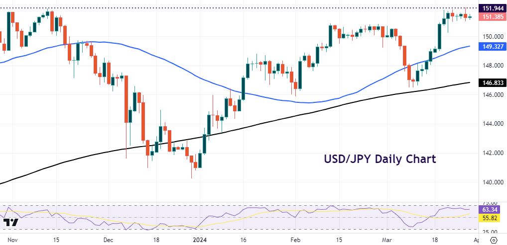 USD/JPY hit a multi-decade high on Wednesday at 151.97, a level last seen in 1990. Markets have been on high alert for intervention which previously came around here in October 2022. The Ministry of Finance sold $15-20bn initally in September of that year and a total of around $70bn over two months.  Remember that officials check the rate of change more than levels.