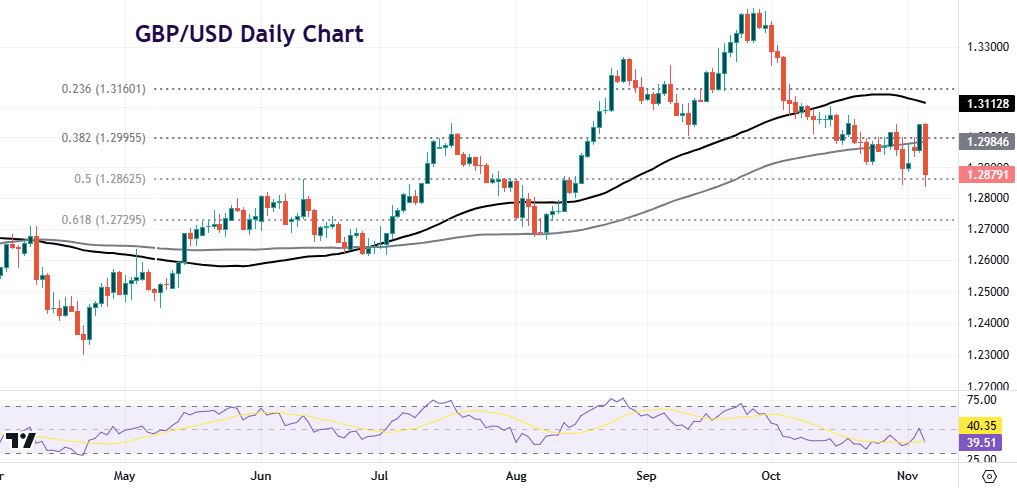 GBP sold off to levels last seen in mid-August with a low at 1.2833 before paring losses. Eyes are on the BoE meeting with an expected 25bps rate cut priced in. Any talk on last week’s UK Budget will be key for policy guidance.