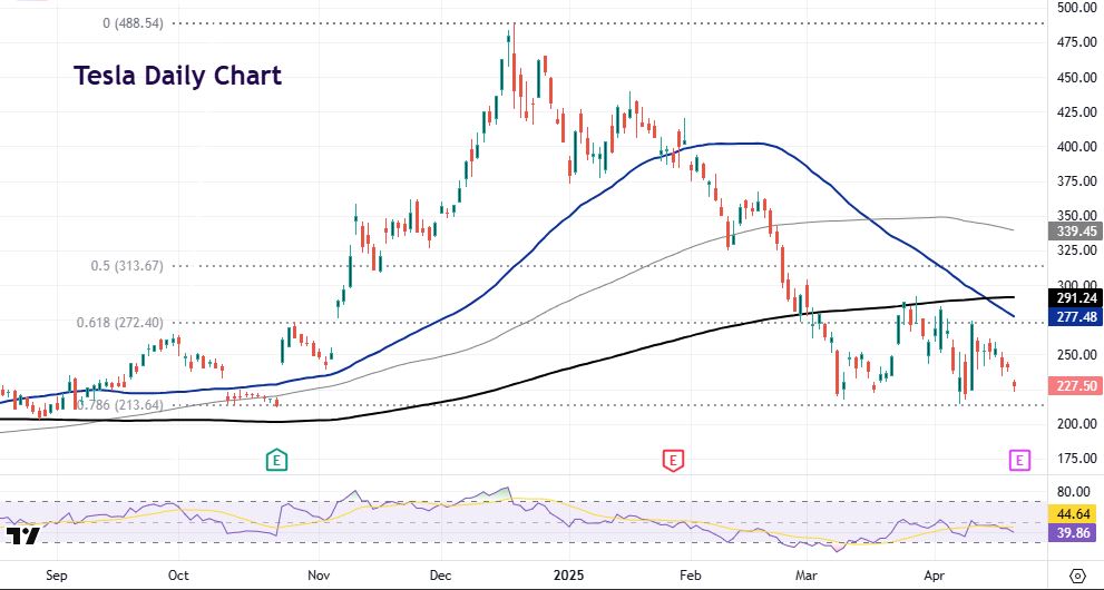Tesla stock is down over 53% from its record intraday high in mid-December. That was around the peak of the Trump trade when his resounding election victory was set to see markets continue to boom on tax cuts and deregulation, among other favouralbe policies. Fast forward, and investors await Tesla’s Q1 earnings release with some trepidation. There is a major support zone around $212 to $217, the October 2024, March and April 2025 lows. This also tallies quite closely with a minor Fib retracement level (23.6%) of the April 2024 bottom after results to the record top, at $221. Support below is at $202 and $182, while initial resitance is $272. The 50-day SMA has just dropped below the 200-day SMA which denotes a bearish death cross signal.