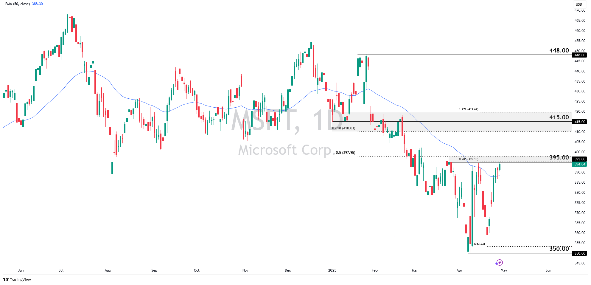 MSFT is retesting the 50-EMA and $395 resistance level, in line with the 50% Fibonacci Retracement and 78.6% Fibonacci Extension. A breakout of this resistance level and above the 50-EMA would see stronger bullish momentum taking hold, and the price could rise further to test the $415 resistance zone, in line with 61.8% Fibonacci Retracement and 127.2% Fibonacci Extension. Further gains beyond the $415 resistance level could prompt a rally toward the $448 swing high resistance.
