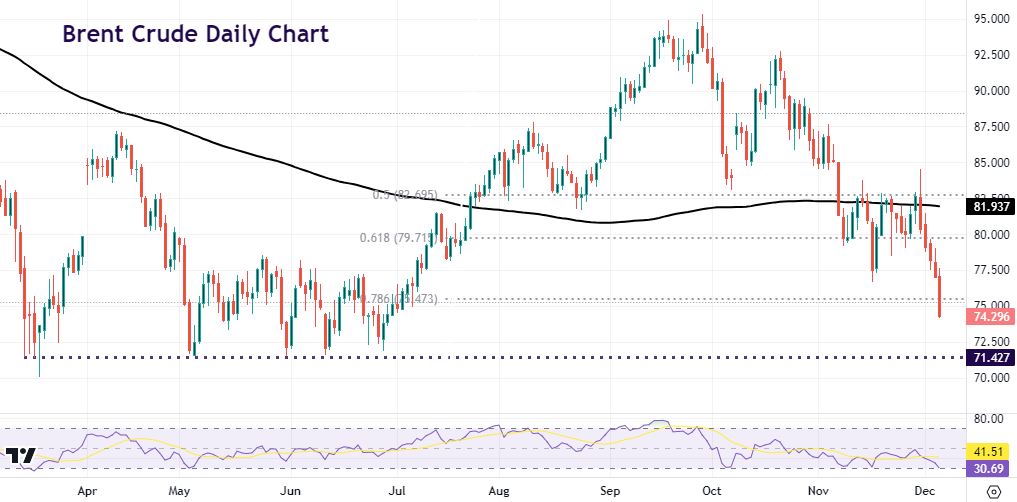 Brent fell though the long-term midpoint of the 2020-2022 rally at $75.24. a minor Fib level of the March to October move is at $75.47. The next major support zone is around $71.50 where the lows form March, May and June reside.