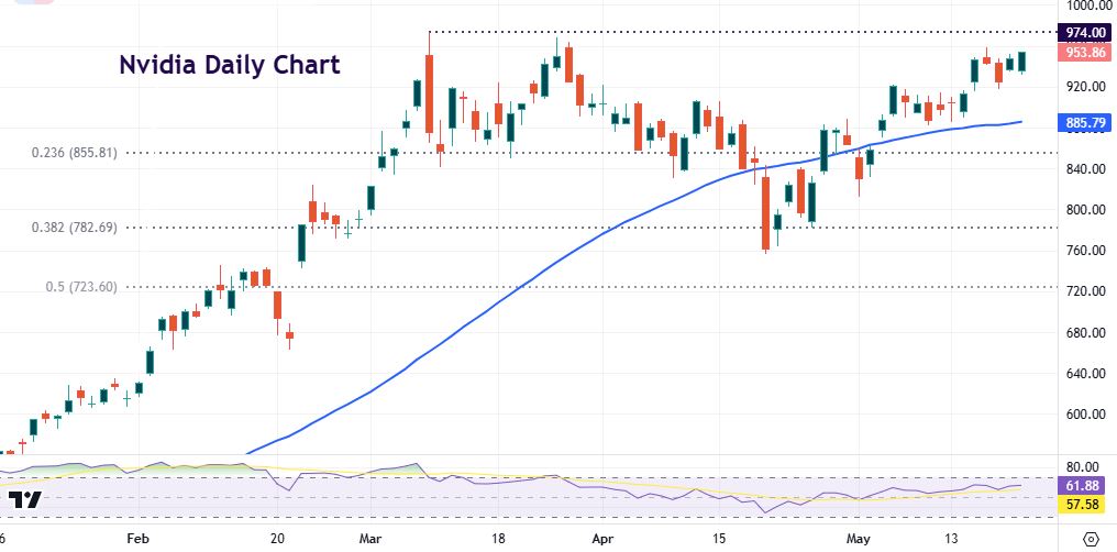 Nvidia’s quarterly results on Wednesday could set the tone for US stock markets and hit the wider indices due to artificial intelligence being such a huge driver of market sentiment. The chip giant is expected to report a massive jump in revenue and profit for its fiscal first quarter. Revenue is expected to rise to $24.8 billion, from $7.2 billion a year earlier, with earnings per share soaring to $5.57 from $1.09, according to LSEG data.