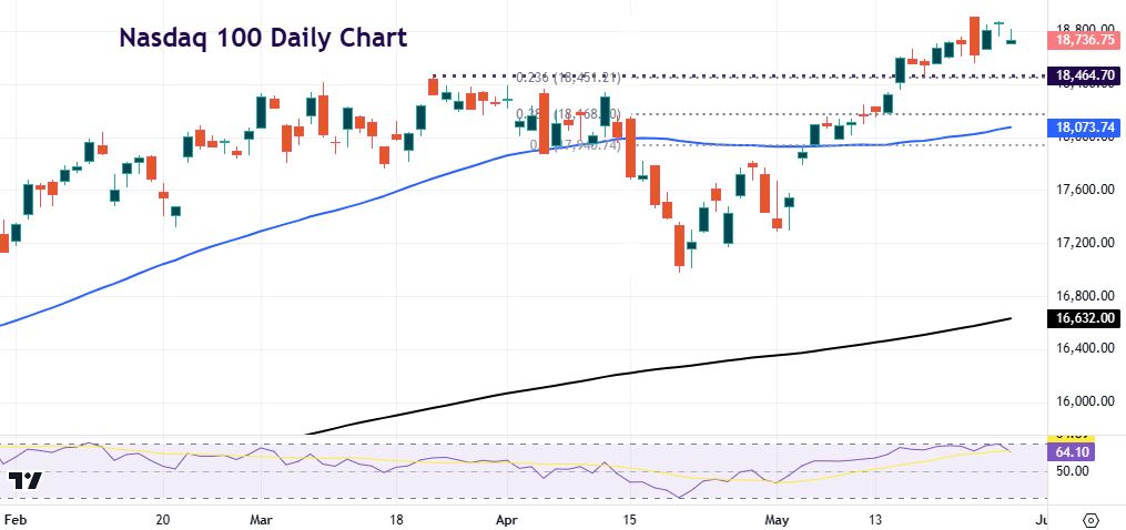 For the indices, the tech-dominated Nasdaq, up 8.6% this month, has strongly outperformed the Dow. Current rotations from more defensive sectors seem to be driven by AI exuberance more than macro and micro factors, like stronger yields. Add to this the ongoing meme stock frenzy and you can see where we are coming from. The record high remains in reach at 18,907 with strong support around 18,464.70.