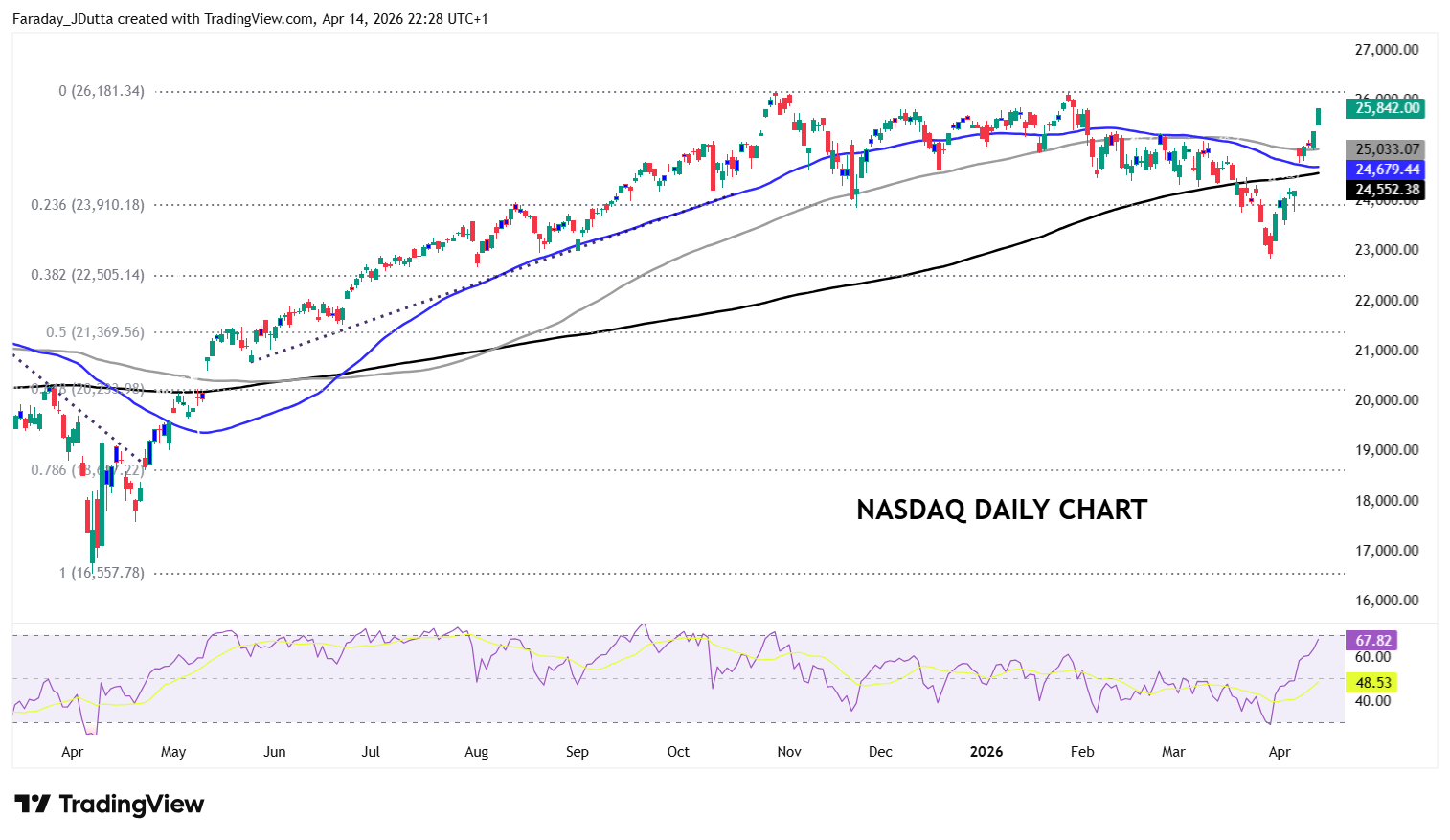 The equity rebound has been led by the tech sector which means the tech-laden Nasdaq has outperformed. The downtrodden software sector has done the heavy lifting this week with US software rebounding near 7%, and companies like Oracle rallying 18%. The earnings season is likely a big reason along with more positive sentiment. The US is expected to deliver another impressive quarter of results. Consensus looks for 12% earnings growth in Q1 for the S&P 500 as a whole, with an impressive 9% coming from the top line. Tech is the standout as it is expected to print close to an astounding 40% earnings growth. With valuations slightly discounted after the recent slide, equities were cheap and are being snapped up in a 10-day win streak. The record high sits just above 26,000 with the 100-day SMA below at 25,033. The 50-day SMA looks like it is going to move below the 200-day SMA around 22,679/602, which would typically be a bearish death cross.