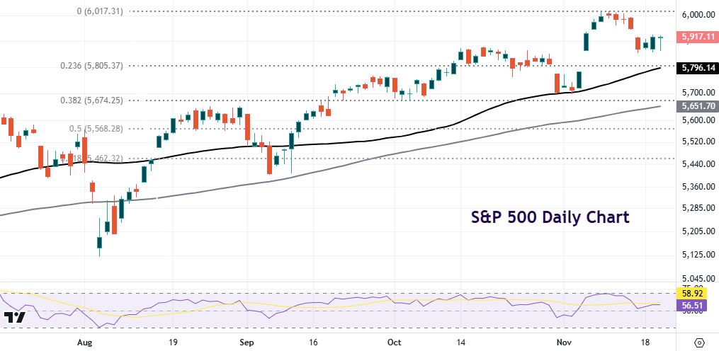 A Santa rally would take the index up to record highs above 6,000. Otherwise, a deeper correction will challenge initial support at 5,805 which sits just above the 50-day SMA at 5,795. The next, major Fib retracement level (38.2%) of the August rally is at 5,674.