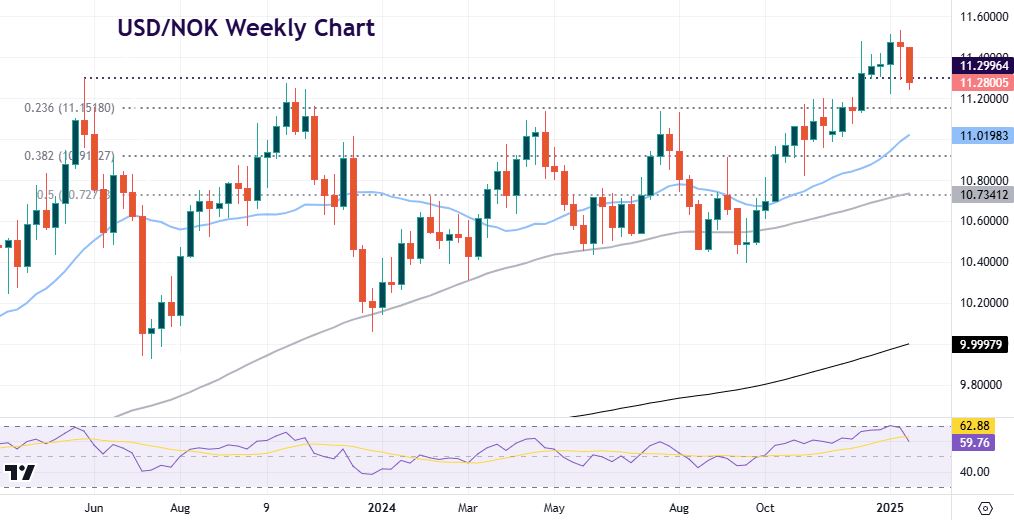 The pair pushed up to levels last seen during the pandemic spike above 12 in 2020. Prices had struggled around the closer long-term top at 11.29 from May 2023. The recent upside breakout may be a false one if USD/NOK closes decisively through that level on the week. Minor support at 11.15 is the Fib (23.6%) of the range move from the mid-July low to the recent high.