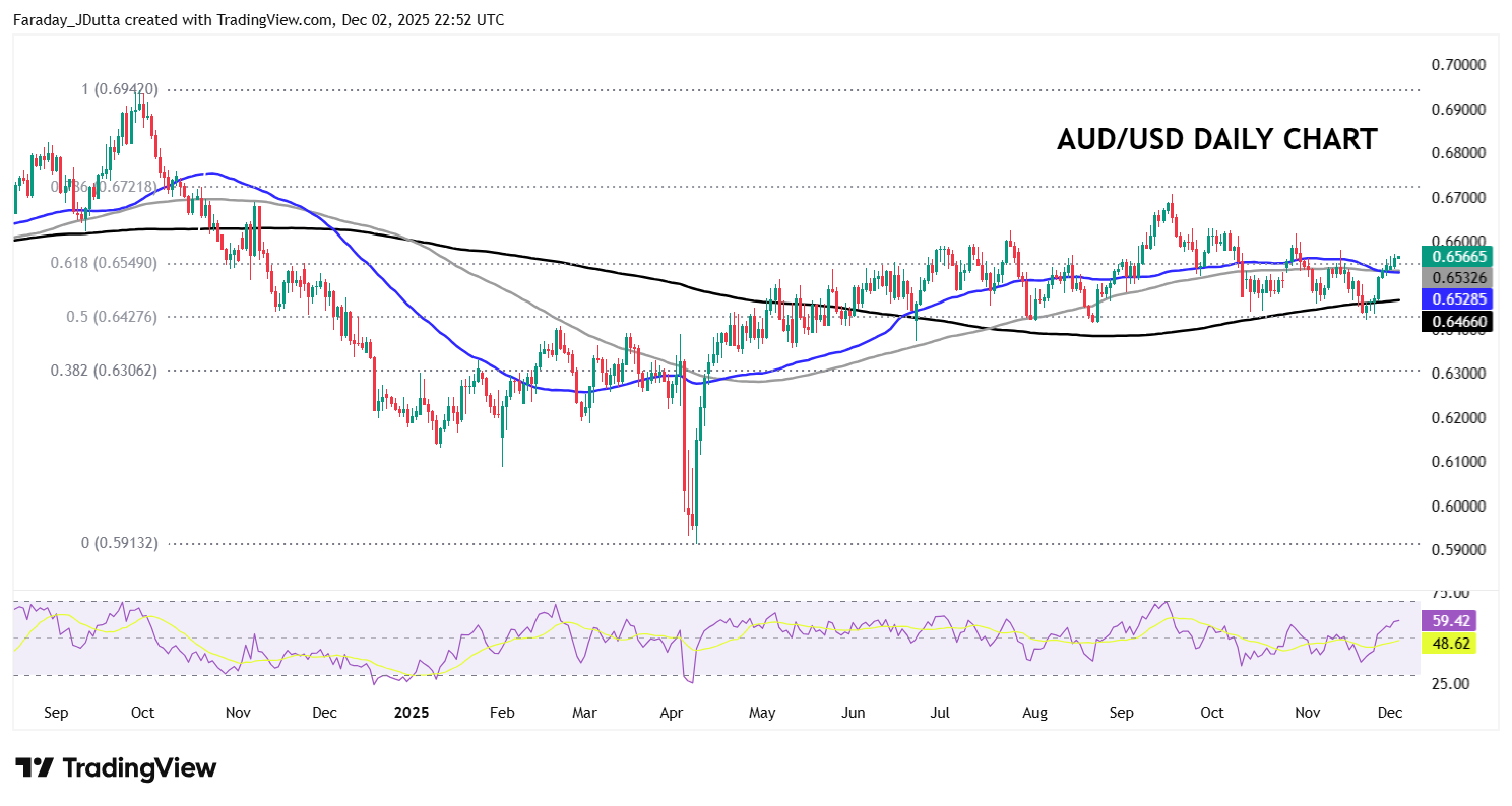 The RBA is not near cutting rates again after recent hotter than expected price pressures.  That’s according to CBA and NAB who expect the RBA to be on hold for an extended period of time/foreseeable future. But Westpac continues to expect two 2026 cuts, touting May and August. The bulls have helped the aussie surge seven days in the last eight and above the 50-day and 100-day SMAs. The major has actually been rangebound for some months between the lows 0.64s (the midpoint of the September 2024 to April 2025 move) and around 0.66. The 200-day SMA has acted as support, now at 0.6466. The shorter-term SMAs sit at 0.6528/32 with the September high just above 0.67. Play the ranges with bullish momentum ticking up.