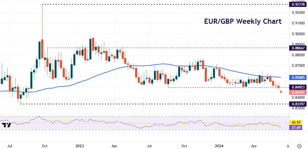 EUR/GBP has recently been testing the 2023 and 2024 lows near 0.85. Euro weakness eventually pulled the trick after French president Macron called snap elections following a weak showing in EU elections. Strong UK data and more hawkish BoE could keep prices below the long-term support/resistance, with eyes on 0.84 and 0.8339.