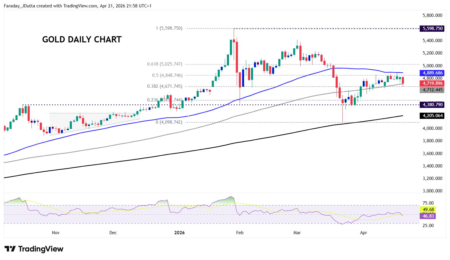 Gold fell early in the week amid renewed inflation fears from rising oil and gas prices. Continued disruptions near the Strait of Hormuz are boosting energy markets, increasing inflation expectations and pressuring gold in the short term. Near-term gains may be capped around the 50-day SMA at $4,889; on the flip side the potential for losses seems minimal. Ongoing geopolitical tensions and persistent uncertainty regarding Hormuz should underpin demand for safe-haven assets, or inflation concerns could ease if there is any ceasefire deal if oil drops. Although gold prices have regained part of their losses caused by the Middle East war, they remain lower than pre-conflict levels due to previous liquidity-driven sell-offs. Price action is likely to remain volatile amid shifting expectations around central bank policy, real yields and ongoing geopolitical uncertainty. The 100-day SMA is at $4,712 with a major (38.2%) Fib level of the record high to March spike low at $4,671 and the halfway mark at $4,848.