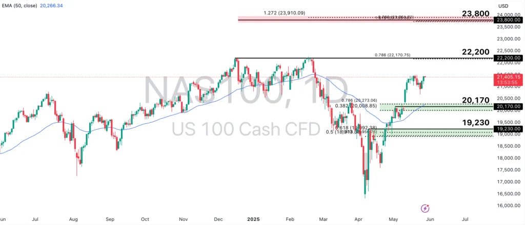 NAS100 has seen a bullish reversal since April 2025 and now holds above the 50-EMA. A continuation of this bullish momentum would see the price approach the 22,200-point swing high resistance, in line with the 78.6% Fibonacci Extension level, or even towards the 23,800-point resistance level, in line with the key zone of Fibonacci confluence.
