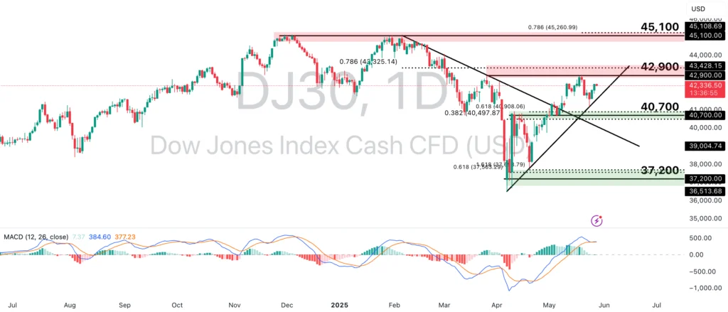 The NAS100 continues to ride the tailwind of the AI revolution, with Nvidia, Microsoft, and Alphabet leading the charge. As of May 2025, the forward P/E is estimated at roughly 28x, a premium to historical averages, underscoring ongoing enthusiasm in the tech sector.