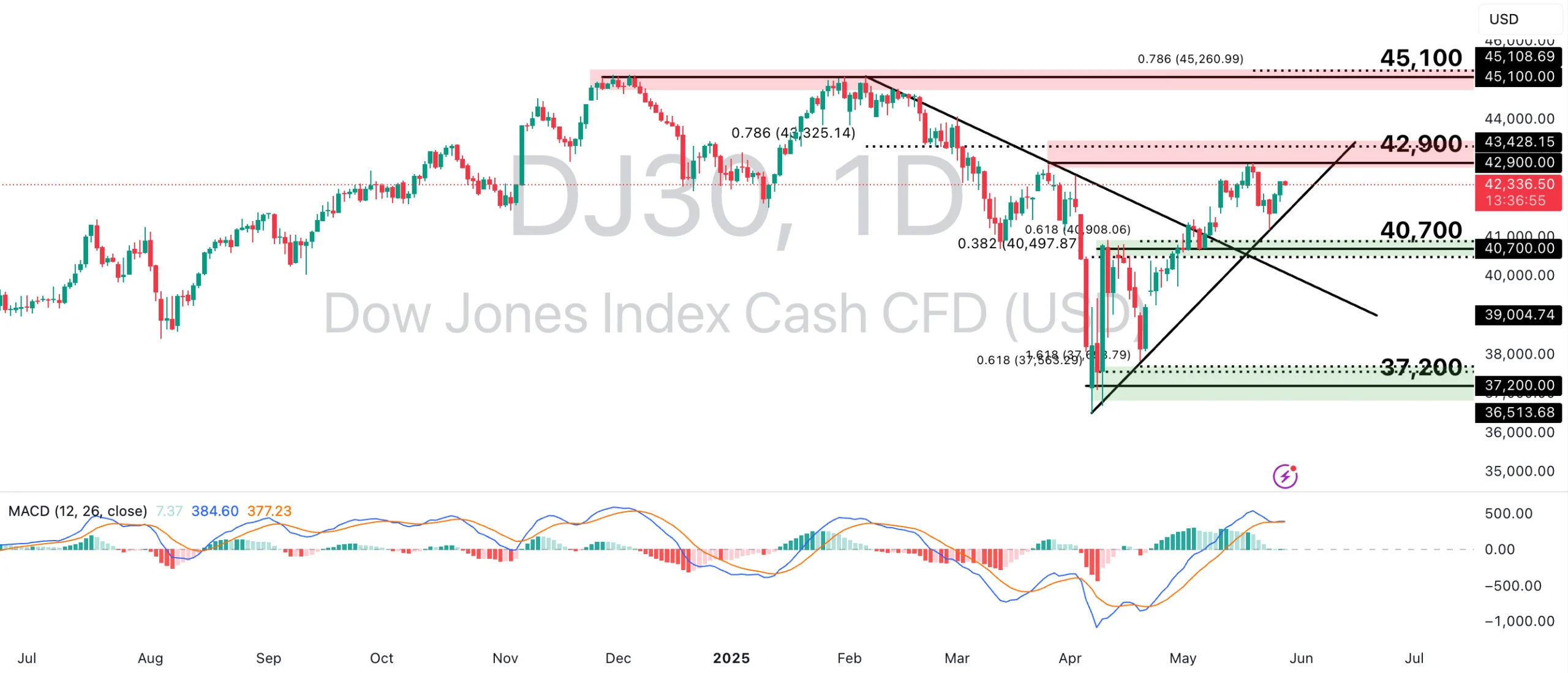 However, if bullish momentum falters, the price could instead test support zones at the 40,700-point level, in line with the 38.2% Fibonacci Retracement and 61.8% Fibonacci Extension levels, and the 37,200-point swing low support, which corresponds to the 61.8% and 161.8% Fibonacci Extension levels. Although the MACD remains in bullish territory, a potential crossover could suggest a slowdown in its bullish momentum.