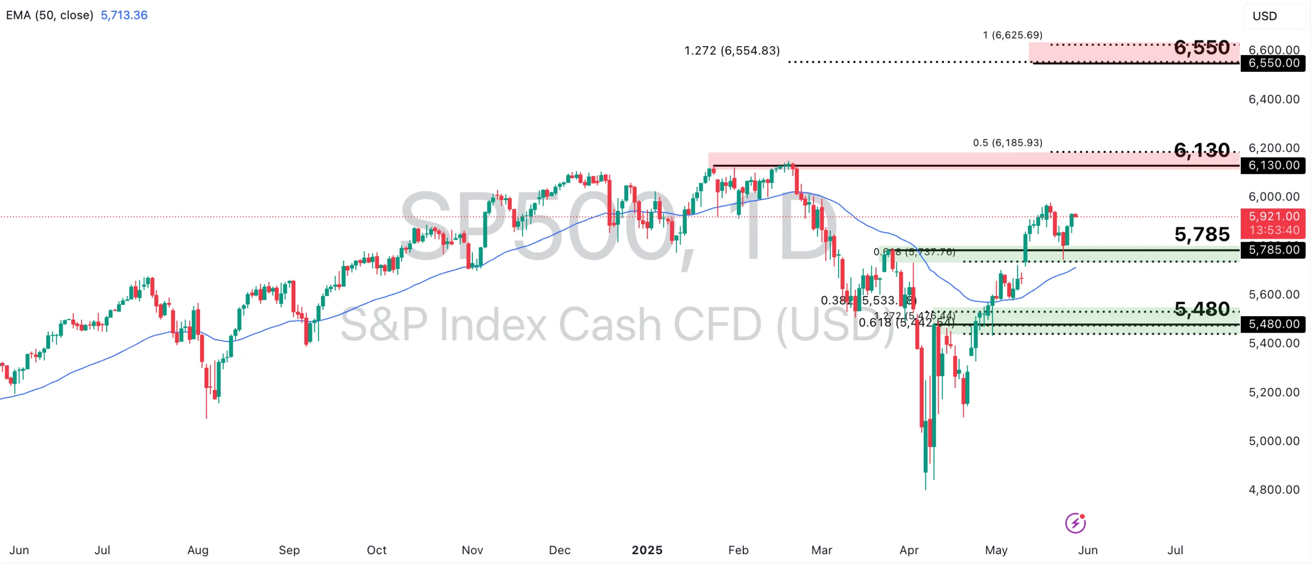 The S&P 500 is currently holding steadily above the Ichimoku cloud and 50-EMA, indicating strong bullish momentum following the trend reversal in April. If this momentum continues, the price could approach the 6,130-point swing high resistance, in line with the 50% Fibonacci Extension level, or potentially rise further towards the 6,550-point resistance, aligned with the 127.2% Fibonacci Retracement and 100% Fibonacci Extension levels.