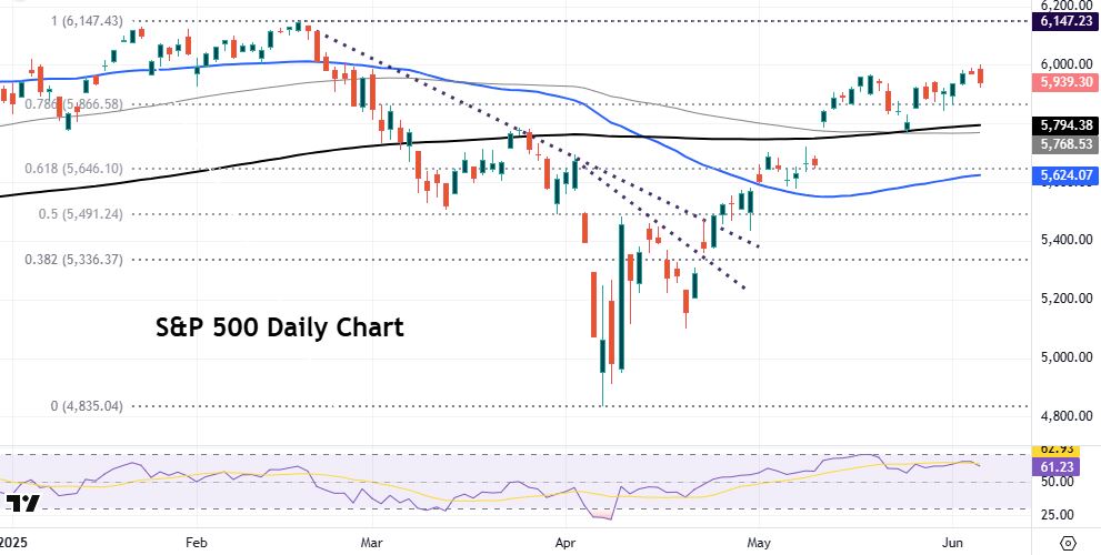 Initial support sits at a minor Fib retracement level of the February-April drop at 5,866. The 200-day SMA resides below here at 5,794, near the late May swing low. The all-time top is 6,147. A strong NFP report would likely be greeted with buying as the labour market remain resilient. Disappointing data may be ignored after an initial sell-off if investors look through the one-off figures.