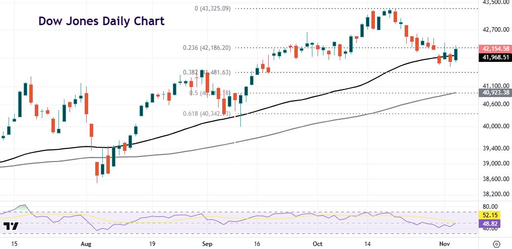 US Stocks closed higher as voters hit the polls. The S&P 500 settled 1.23% higher at 5,782. The tech-heavy Nasdaq 100 added 1.32% to finish at 20,227. The Dow finished up 1.02% at 42,221. All 11 sectors ended in the green with consumer discretionary leading. The benchmark S&P 500 index clawed back about half of its losses from the prior four sessions. It’s a dead heat in some of the contentious battleground states which means a protracted vote count. The VIX remained above its long-term high at 20.45