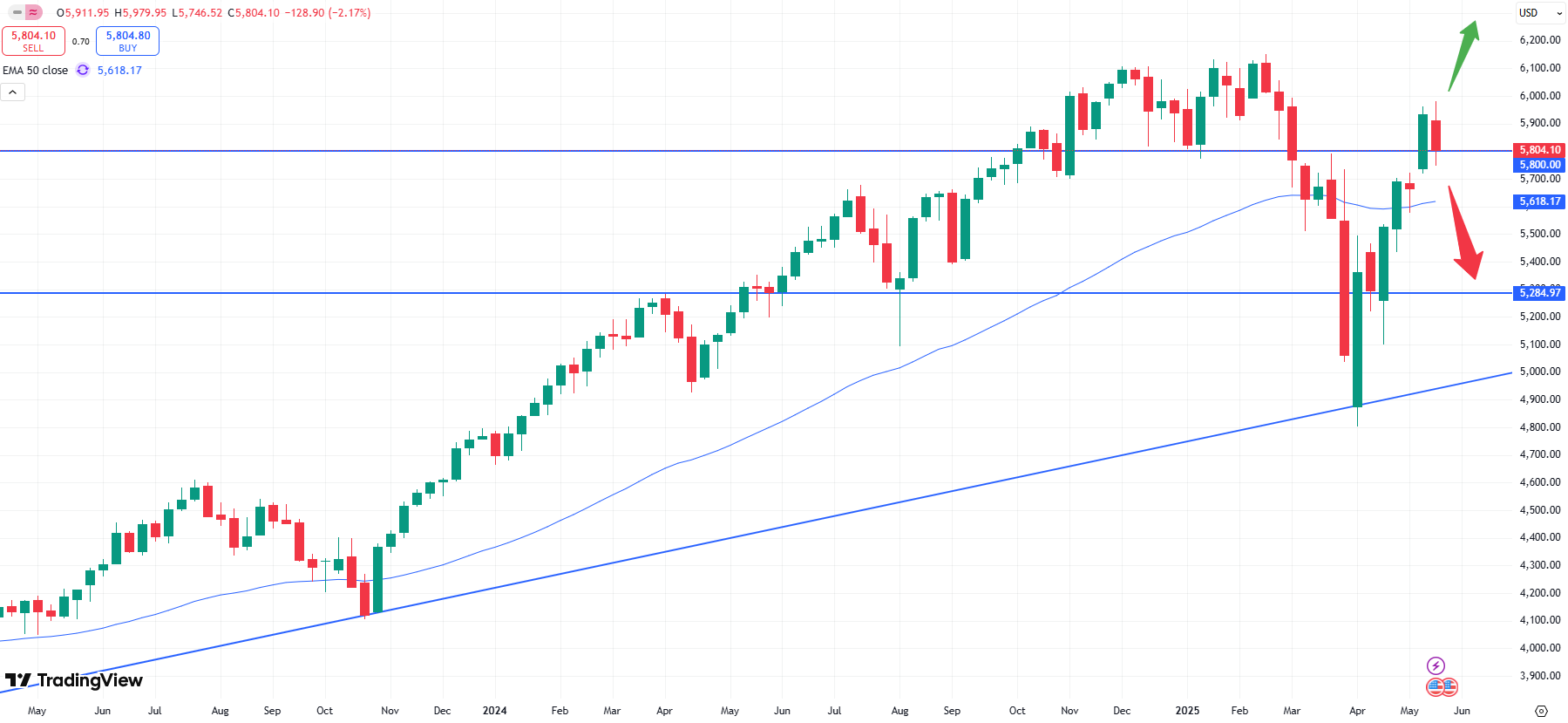 A closer look at the S&P 500 index reveals that the price has started to correct last week. A break of the level of 5,800 might cause an escalation of the downside. This might happen if the PCE index comes in hotter than expected, as the Fed might be expected to remain with their hawkish stand. Else the upside might continue with positive momentum as before. The index from the US will be published on the 30th of May, 2025 at 14:30 CET.