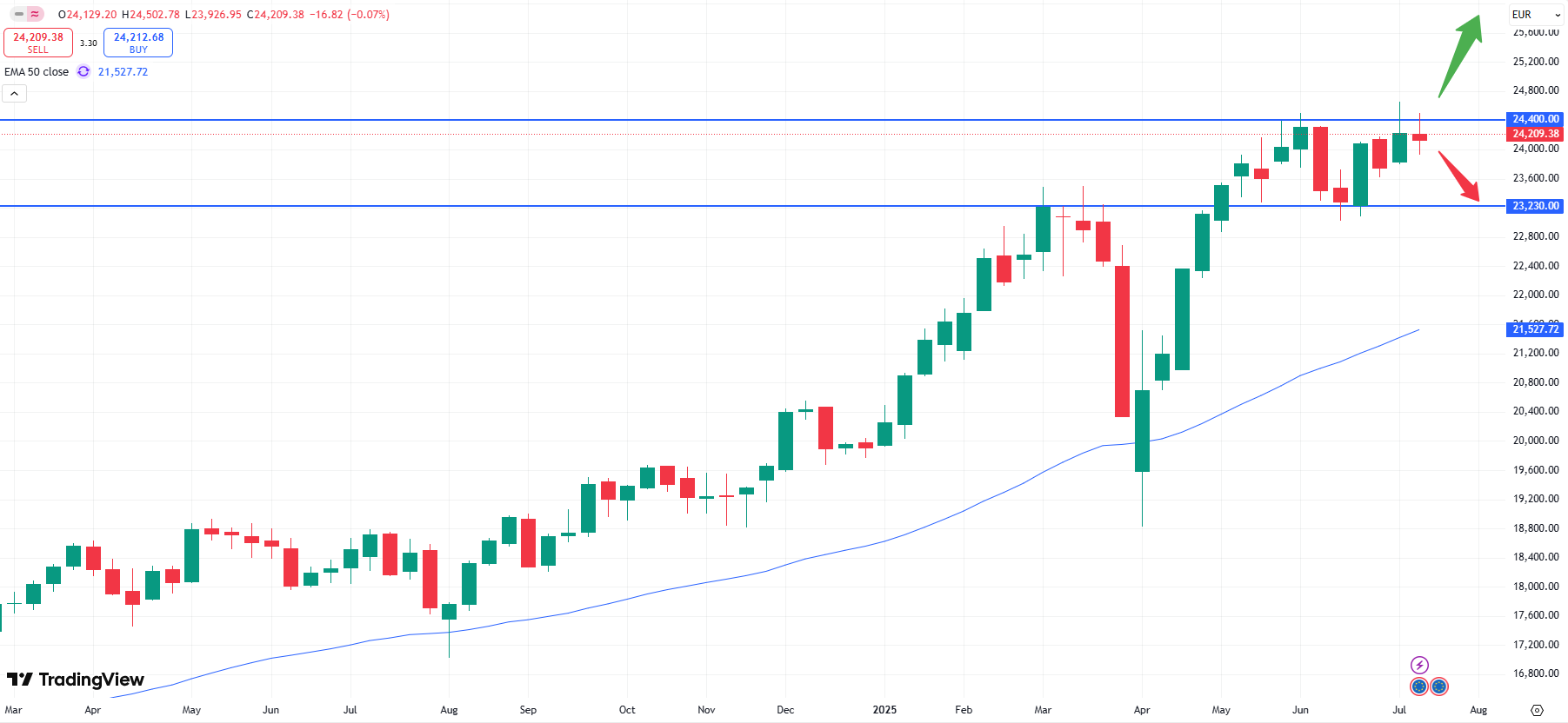 The DAX might be interesting in this case. Positive PMI data, in particular from Germany, could give the German stock index another boost. Higher prices even beyond the 24.400 level might ignite another push to the upside, while a correction towards the previous support zone at 23,230 could offer cheaper entry prices again. Both PMI data will be released on Thursday, 24th July at 09:15 CET and 09:30 CET respectively.