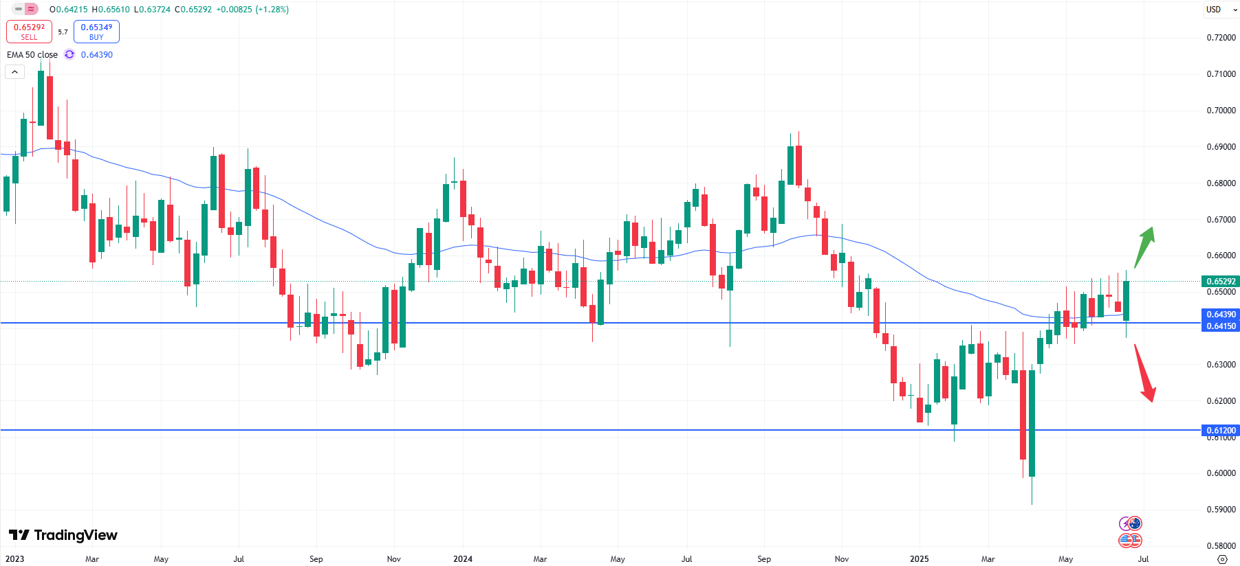 Based on the weekly chart above the AUDUSD currency pair is gearing up fresh momentum. Should the 0.6500 zone hold and won’t break to the downside again more upside might be seen. The positive risk sentiment is currently also being reflected in the currency pair. If stocks rise typically also the AUD is gearing up momentum. The PMI data might be crucial: any stronger reading could cause the Dollar to resume strength as well and hence pull the pair back down. The data will be released on Tuesday, July 01 at 16:00 CET.