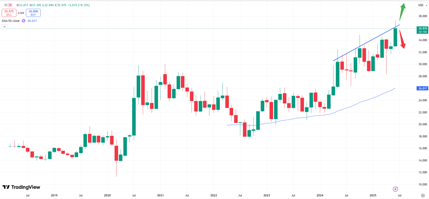 The Silver market might be interesting currently. Based on the monthly chart above, prices have been soaring yet remain capped at a technical resistance zone. A break of this area could offer fresh upside in July, should the weakness of the Dollar continue. However, in particular the early days of a month might offer a retracement of a given trend, which could also be the case here. The data will be released on Thursday, July 03 at 14:30 CET.