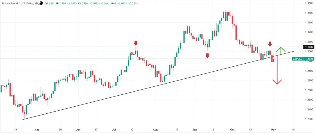 After the GBPUSD tested strong resistance last week the market is now trading around 1.2930. This downside movement was fueled by concerns over inflation from British Finance Minister Rachel Reeves’ budget announcement and weaker US job data. If the downside breakout holds, the rate could fall to 1.2660; if it fails, a rebound to 1.3050 is possible.