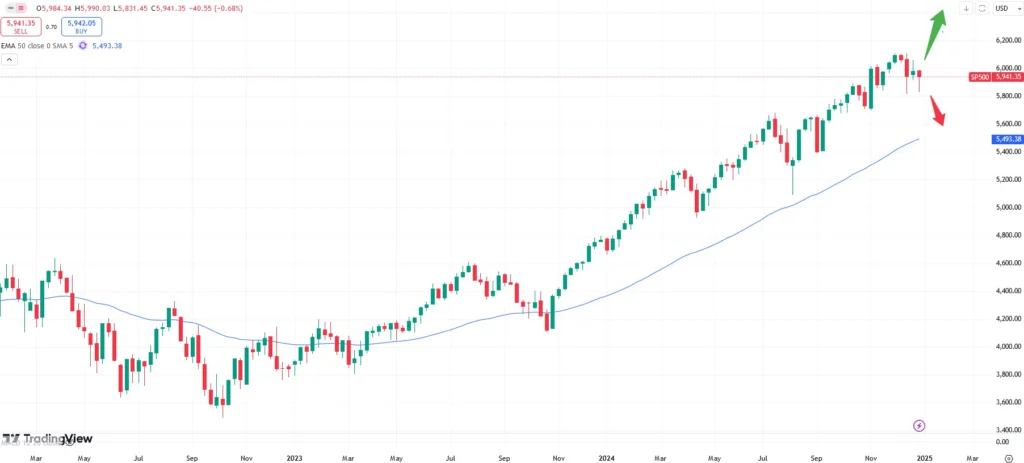 – US- ISM Services PMI – The purchasing manager index is expected to rise slightly after a disappointing number last month. The figure still shows a positive trend and also remains well above the 50- level, which remains a key driver of the US economy. Meanwhile stock markets start 2025 in a sideways pattern. A look at the S&P 500 index might show a potential correction towards the 50- moving average based on weekly charts.