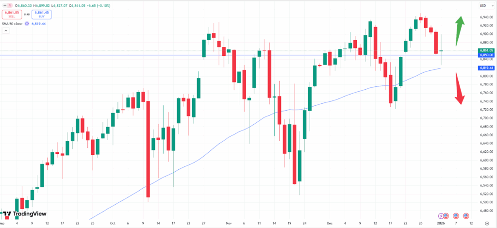 The S&P 500 stock index has started slightly shaky into the new year. However, the uptrend remains generally intact. If the market falls below the technical support zone of 6,850 more downside momentum might occur. Yet, the market remains well supported with the 50- moving average, which is coming as fresh support near that level. If both zones give way, traders should expect a correction, which is not uncommon during the early weeks of a new trading year. Furthermore, upside momentum might occur, if the market can break the recently created all- time- high, at around 6,945. The consumer sentiment index will be released on Friday, the 09th of January at 16:00 CET.