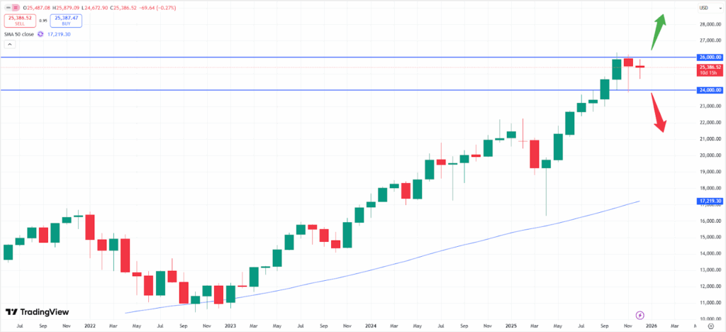 The monthly chart above shows the important levels; traders should pay attention to. The Nasdaq index might break higher and if the 26,000 level can be pushed though might then offer further upside momentum towards the 27,500 range. The recent rate cuts in the US might support the bullish view, paired with some weakness of the Dollar. The recent positive momentum, which started towards the end of last week might now add more buying momentum in this market.